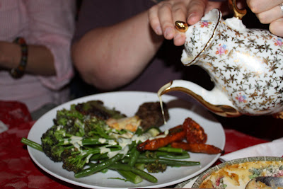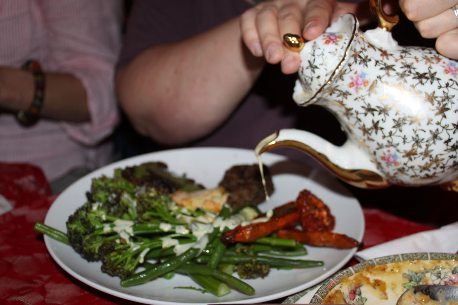 Beautifully cooked vegetable, a cream sauce from a teapot. Again, butch straight men running a tea room with vintage china, lacy tablecloths, award winning cupcakes, the works.