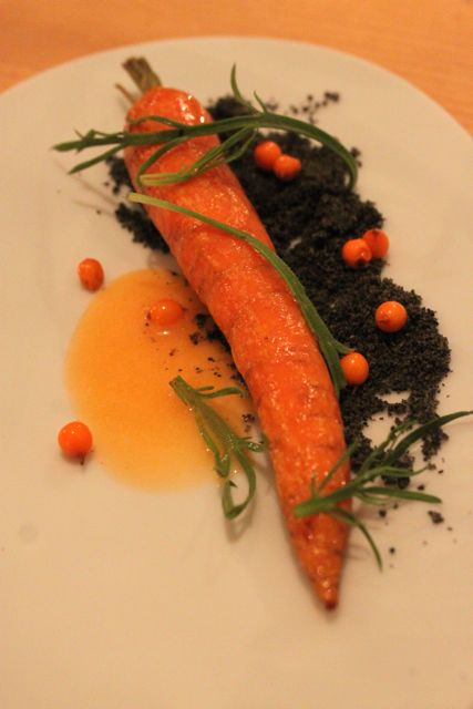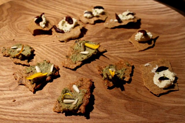 The chef, softly spoken American Rob Martin, influenced by his training at Noma, made some interesting and accomplished dishes: home made seeded rye crackers with pickled wild damsons, raw sunflower spread and wild fennel (camphor) seeds; a dish mixing chickweed, elderberries, cobnuts and mushrooms, a meat dish of duck, blueberries, yarrow and corn on the cob. He also served raw prawns which the chef sat next to me adored, being macho about food; I thought I was going to throw up as I tried to swallow these grey soft bodies.
