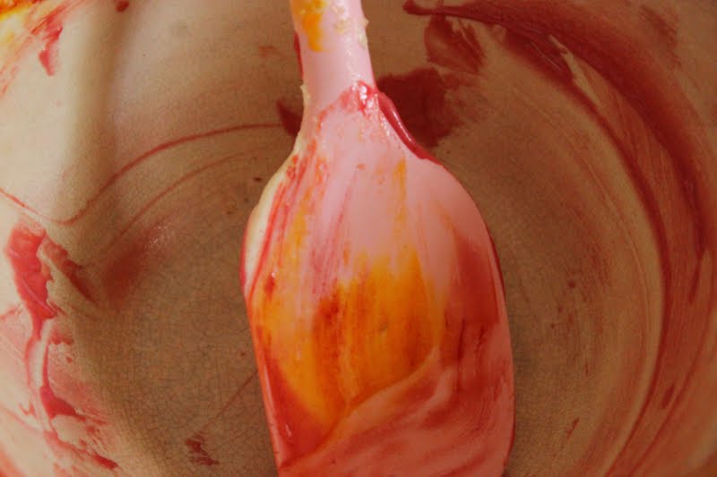 You could also add food flavouring such as lemon essence for the yellow layer, orange essence for the orange layer, mint essence for the green, almond essence for a pale green, chocolate powder for the brown.