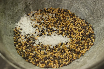 Put the mustard seeds, sugar, salt, turmeric and herbs into a pestle & mortar and blend together.