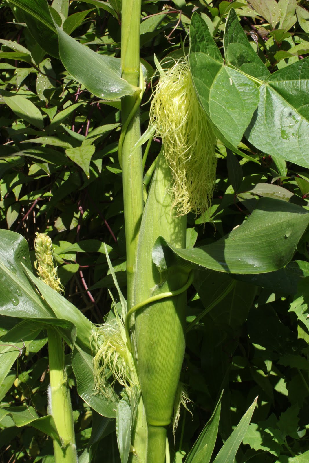 The runner beans climb up the strong stems of the maize