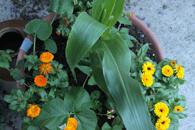 Three sisters: maize, runner beans, squashes with some marigolds