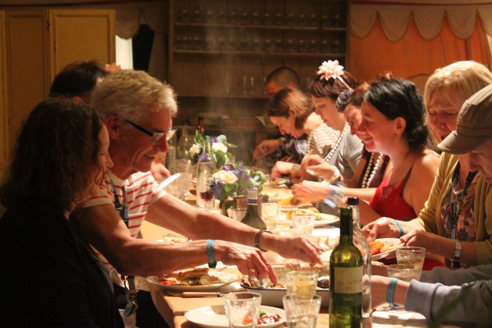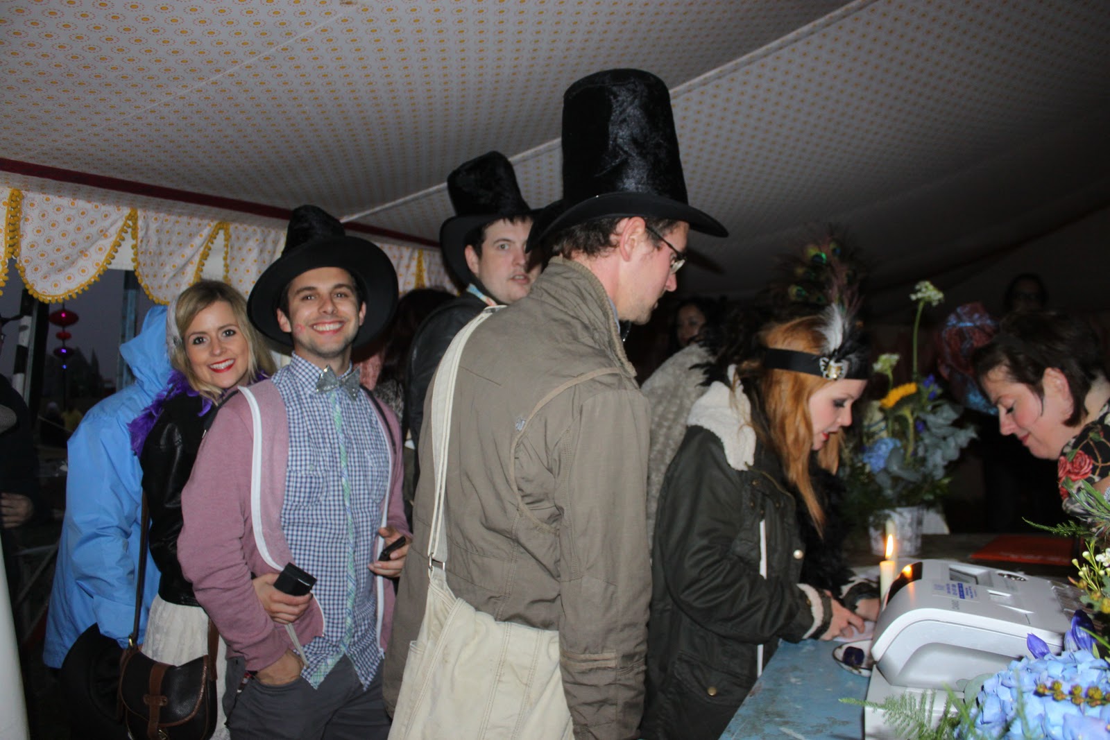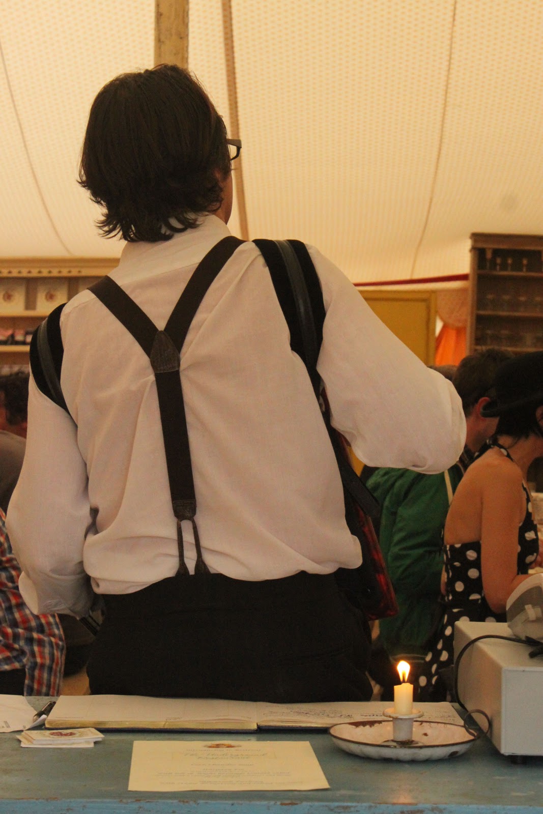 Guests coming to the desk. This lot were completely mashed. The problem with having sittings at festivals is that people forget to turn up. Or get their bookings drastically wrong…several people came either two days early or two days late.