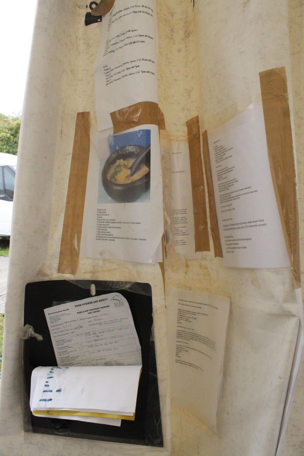 The kitchen was only up and running a few hours before first service Thursday night. We had to wait a day for the carpenters to put a floor down. Only then could we properly spring into action. Above: a ‘noticeboard’ taped onto the kitchen tent walls.