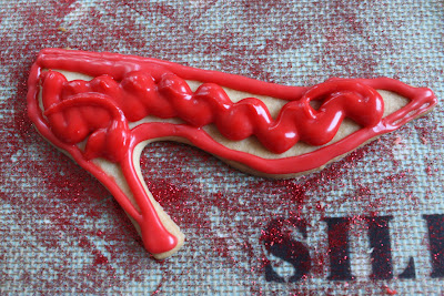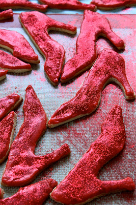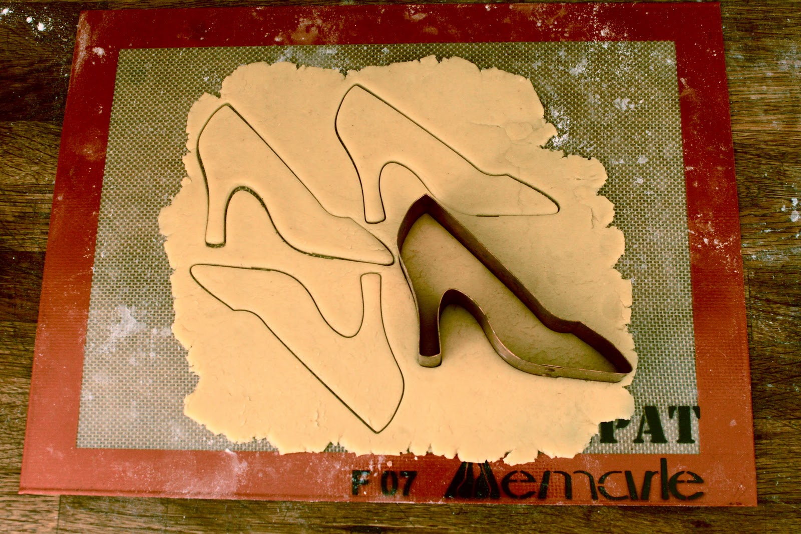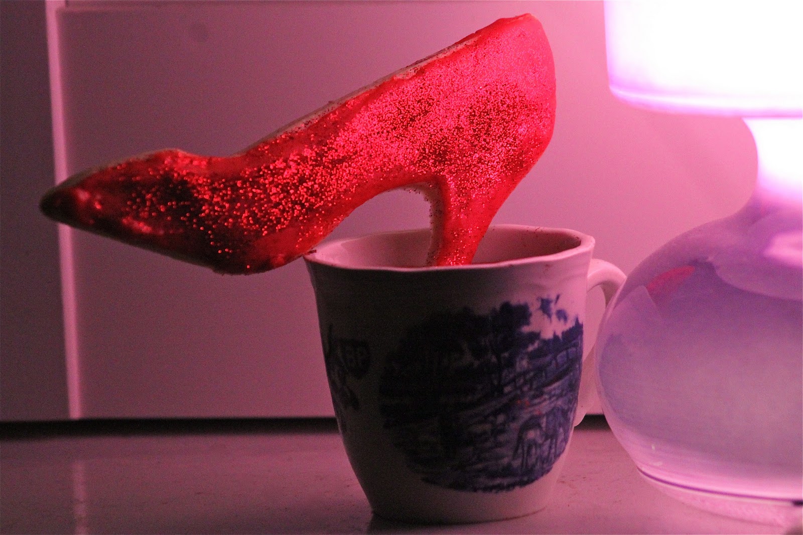 Add the glitter while the icing is still wet by dipping a dry pastry brush into the pot and flicking the brush over the shoe with your finger. You want an even layer of glitter.