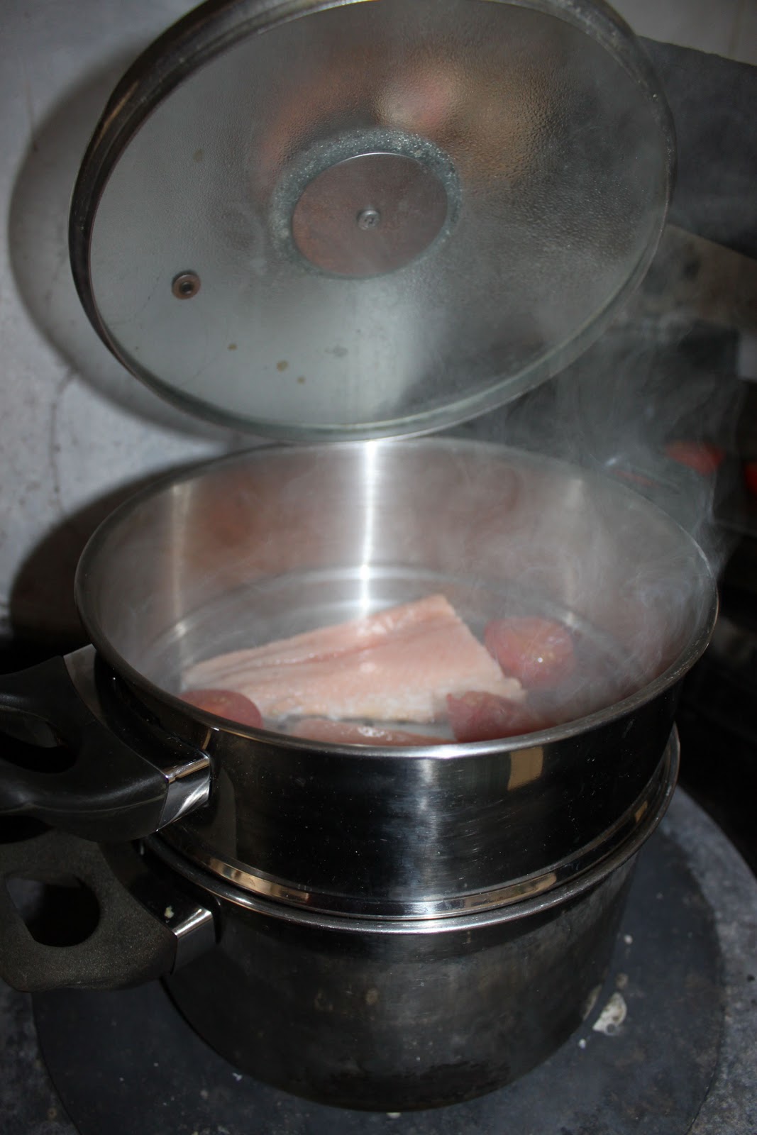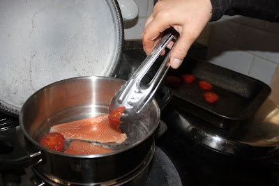 Place the food (here we have trout and tomatoes) onto the steamer basket. Put on the lid. I marinated the trout in a whisky/sugar/salt solution for an hour inspired by the recipe in Annabel Langbein’s book The Free Range Cook.