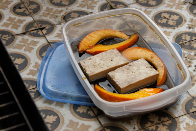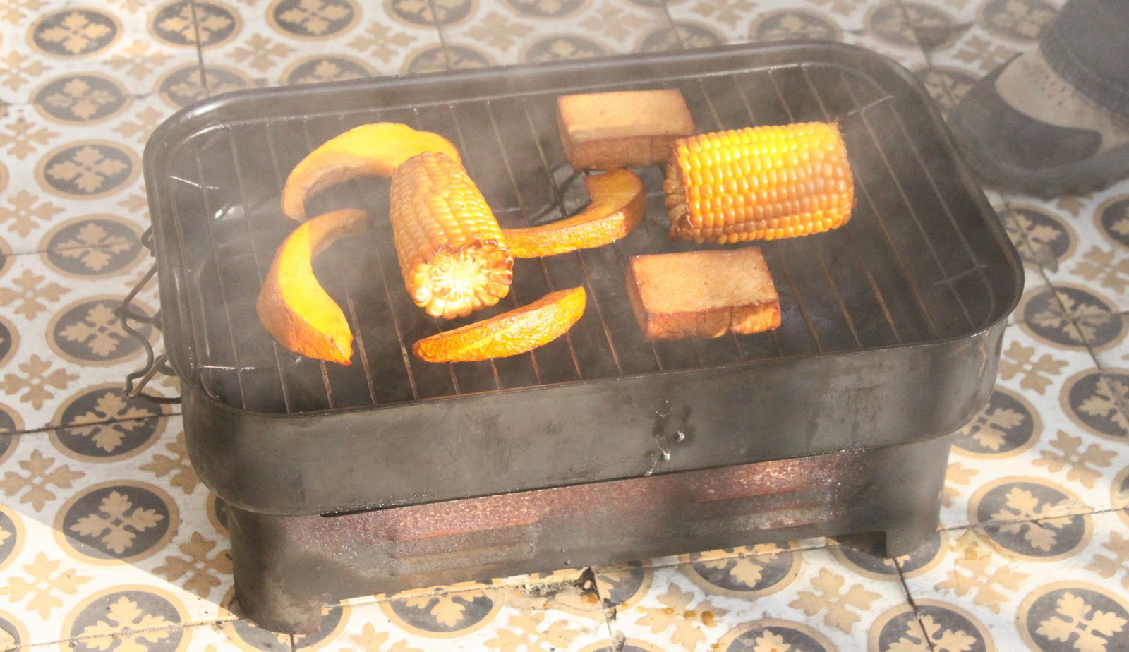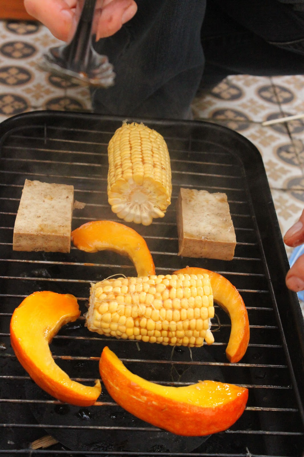 We hot smoked tofu, lemons, corn on the cob, peppers, garlic, pumpkin slices and apples.