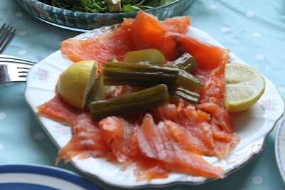 First of all cure the salmon by mixing half and half sugar and salt (gros sel) with aromatics such as fennel seeds, juniper berries, dill, whatever you feel like. I also sprinkled vodka over the salmon as well as pickled cherries. Pile this mix along the length of the salmon side both underneath and on top. Weigh it down and after 12 hours, drain off the liquid, scraping the sugar/salt mix to one side. Turn over the fish and cover once more, underneath and on top with the curing mixture. Weigh it down again. After another 12 hours your fish is cured. You will be able to feel that it’s stiff.