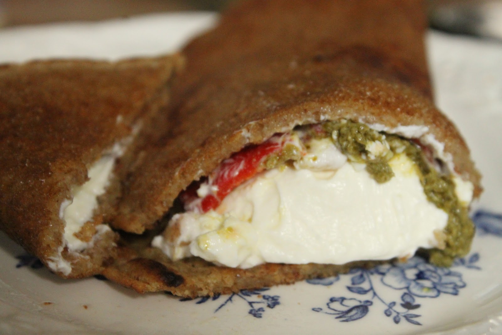 I boosted the flavours with a spoonful of pesto and a scattering of pinenuts, but you can play with ingredients: blue cheese and green pickled peppercorn or capers, smoked salmon and cream cheese, fried egg with truffle salt. Anything you have left in your fridge or that you would cram into a Breton crepe would work here.