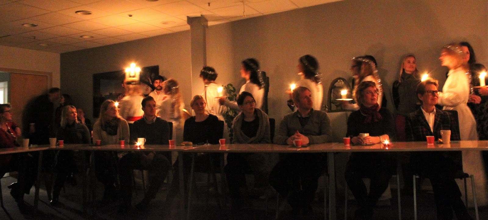 At 9am at the tourist office, the employees gather with a glass of glogg or coffee and some saffron buns or pepperkaker biscuits and sit around a large U shaped desk waiting. Slowly a procession of choristers enter the room and sing. This St. Lucia is wearing a headpiece with real candles, we can see the wax dripping onto her hair. Needless to say, she remains upright and immobile but her singing is bright and pure. It’s a very special experience.