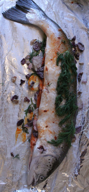 Roasted whole salmon with rose harissa, couscous with pomegranate seeds, pine nuts, pistachios, salted lemons, crystallised rose petals