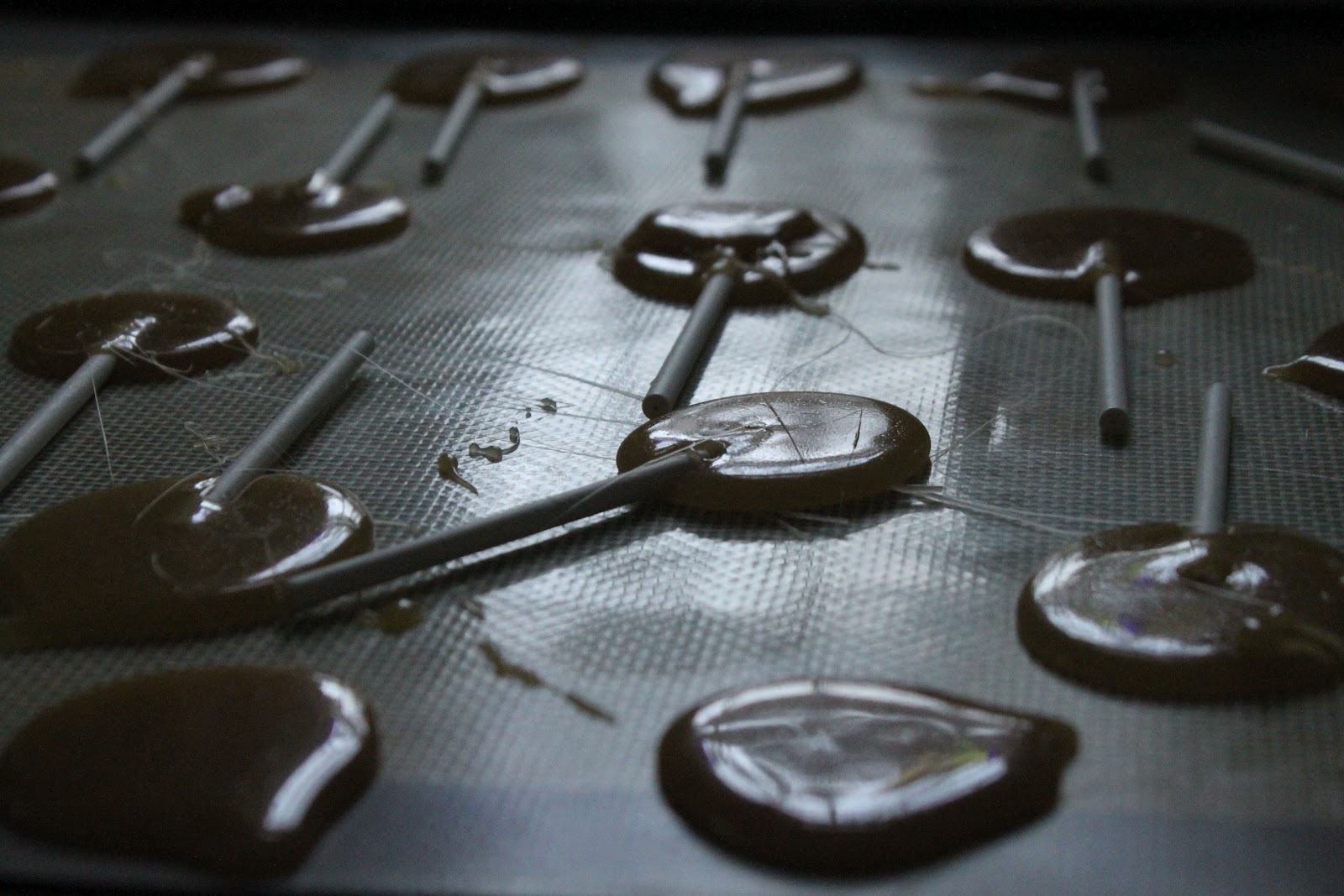Then, spoon (carefully, I got a big blister when I did this, so use a long handled spoon) circles of the caramel onto your silpat (buy one of these too. I mean it. )