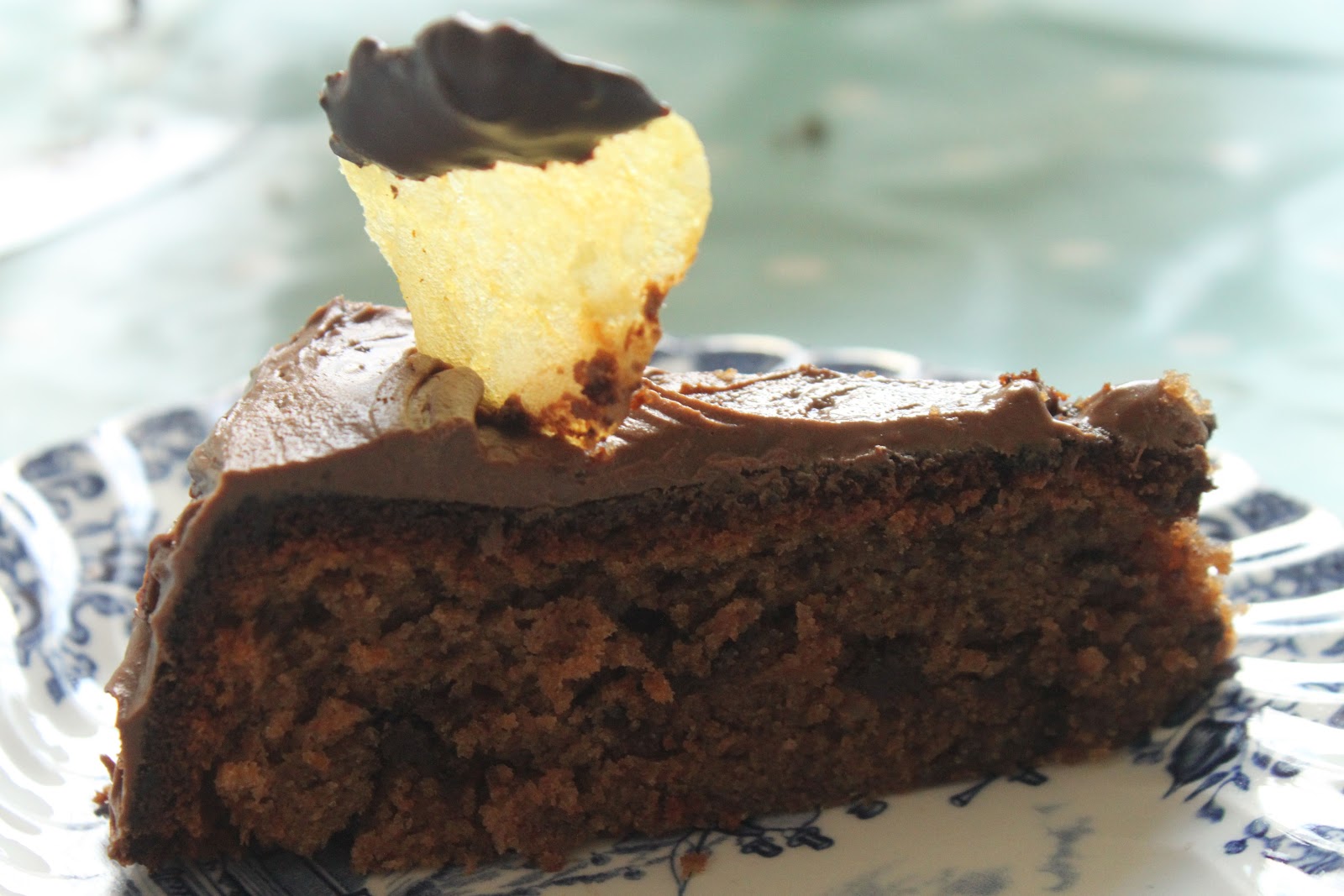 | Chocolate Potato Cake with chocolate dipped potato crisp on top |