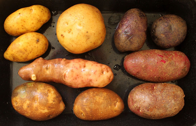 There are something like 450-500 varieties grown in the UK, but only a few of these ever make it into the shops. To find some of the more unusual potatoes, you’ll need to look online for mail order suppliers, at Farmers’ Markets … or grow them yourself.