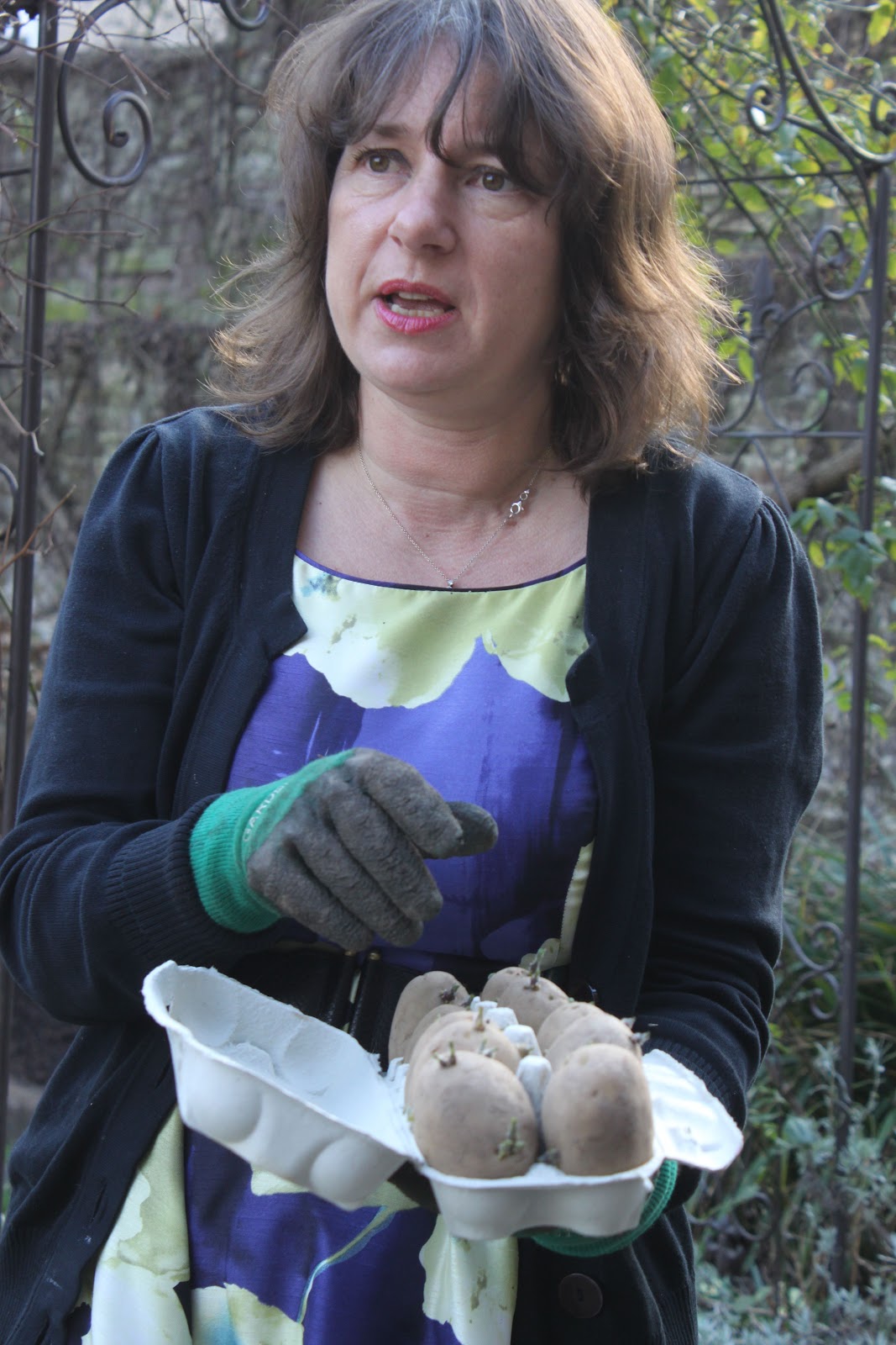 When we planted them, the Lady Christl potatoes had little shoots emerging. This means the  potatoes have been chitted, ie, stored in a light cool place so that the shoots develop. Note, a light cool place. If you want to store potatoes for eating, keep them in the dark. If you want to store them before planting, keep them in the light.