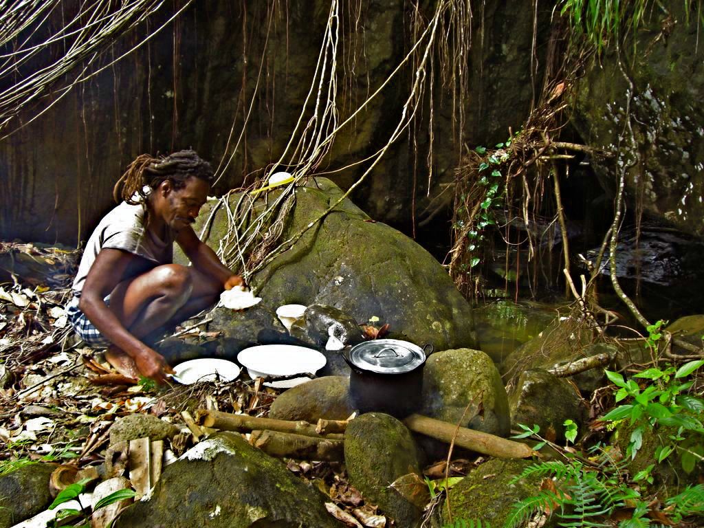 All of them made it their business to teach me the patois (now for the most part forgotten) and I made it my business to learn as much as possible about their food – the growing, cooking and eating of it. Jean, a gentle faced man from Haiti stripped the coffee tree next to his house of its fruit and taught me how to process the beans right up to dry roasting them in a frying pan – he also taught me how to recognise the now unmistakable smell of the large boa constrictors occasionally found in the hills above the hotel. I also learnt how to process cocoa, watching locals dry the beans in the sun behind their houses – and that I never needed water when out walking along the country lanes close to the hotel, as I could always pick a ripe cocoa pod, eat the white flesh which cocooned the beans for instant refreshment and energy boost.  Anise took me up to her father’s land in Carib Territory (the only reservation in the Caribbean, really called Kalinago – they hate the Carib moniker and its cannibalistic connotations) to show me how watercress had colonised great swathes of the fast running stream which cut through his carefully farmed terraces. Mona taught me a couple of the dishes on this menu, and a visit to her sister’s hog farm resulted in a lively discussion with all the staff about exactly how boudin noir should be spiced. James made me baskets from woven larouma and bowls from the calabash which hang in my kitchen today. I cooked vegan food over fire with a strict Rastafarian, tried a zillion types of infused cask rum (regretting the marijuana rum, one sip of which floored me), learnt to recognise my seasoning peppers from my hot, haggled with the boys who would turn up at the kitchen with buckets filled with fresh water crayfish or titiri (teeny little fish used to make accras) and made the most of the abundance of fresh produce.