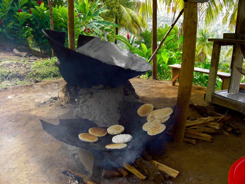 The traditional diet in Dominica is very healthy – lots of anti-oxidant rich fruit – mangoes as big as a small child’s head, sour carambola (starfruit) totally different from the insipid sweet variety we get here, custard apples, sour oranges (essential for rum punch), nutty red bananas, despised by the locals as they aren’t as sweet as their yellow cousins, fresh coconuts. There is little meat or dairy, seafood is sold at a premium which is why most people eat more salt fish and smoked herring than fresh, and every meal is predominantly provisions –  the starchy foods which make up the bulk of every meal – green bananas, tania, dasheen, cassava (also ground up and made into a rough textured, nutty flatbread), breadfruit (best cooked whole over charcoal. Scrape off the blackened skin, cut into slices and fry in butter or coconut oil) and of course the myriad variations of rice and peas or beans. The carbs were necessary because the work throughout most of Dominica was intensely physical, and most people walked everywhere or hitch lifts. People in Carib Territory regularly used to live in their 100s, but things have changed now of course. People aspire to more sedentary jobs, they are more dependent on processed foods, sold in the supermarkets which will not let you buy unless you pack your purchases in their disposable plastic bags, cars snake round the block queuing for the drive thru KFC and obesity has become increasingly common amongst the younger generation. The main market in Roseau (which starts at 2am on Friday morning) still sell oil drum-grilled plantain, rotis and doubles but US style fast food is gaining ground.