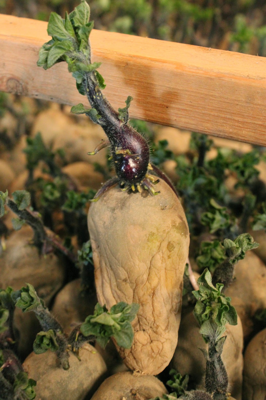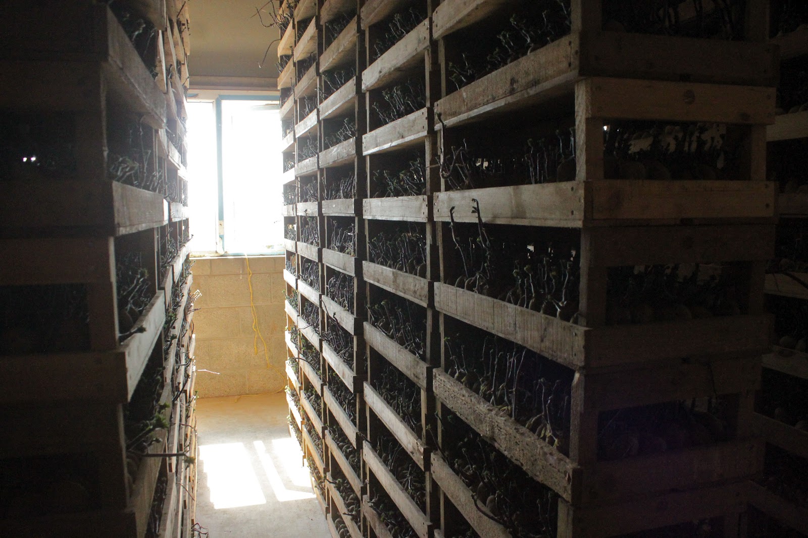 Jersey Royals, in ideal conditions, start at the end of March and last till the end of June. We are now moving from the indoor season to the short outdoor season. It’s an important crop for Jersey: fifty percent of Jersey’s export market is comprised of the royals. They command a premium price, but the UK is pretty much the only market, although the French market is being worked upon. (I remarked that the skins might be a stumbling block to gaining popularity in France; I once cooked new potatoes, leaving on the skins, for Parisian friends who were horrified by this practice).