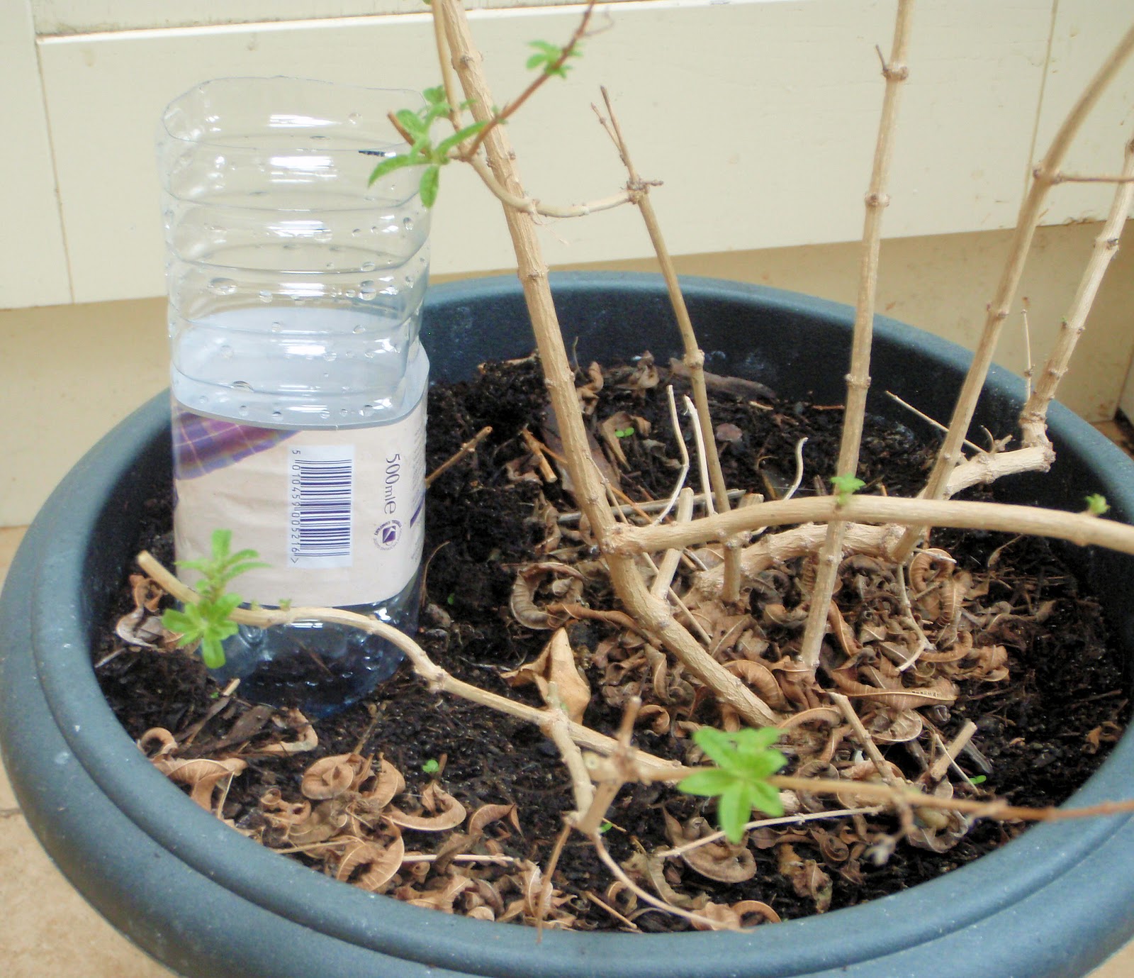 5. Another way to ensure the roots get all the water is to cut the bottom off an empty 500ml plastic water bottle. Unscrew the cap and remove, then push the bottle, cap-end down, into the soil next to the plant. Fill up the inverted water bottle from your watering can and the water will be directed straight to the roots. This is an excellent way to water leafy plants like tomatoes, which do get thirsty in summer, and aubergines.