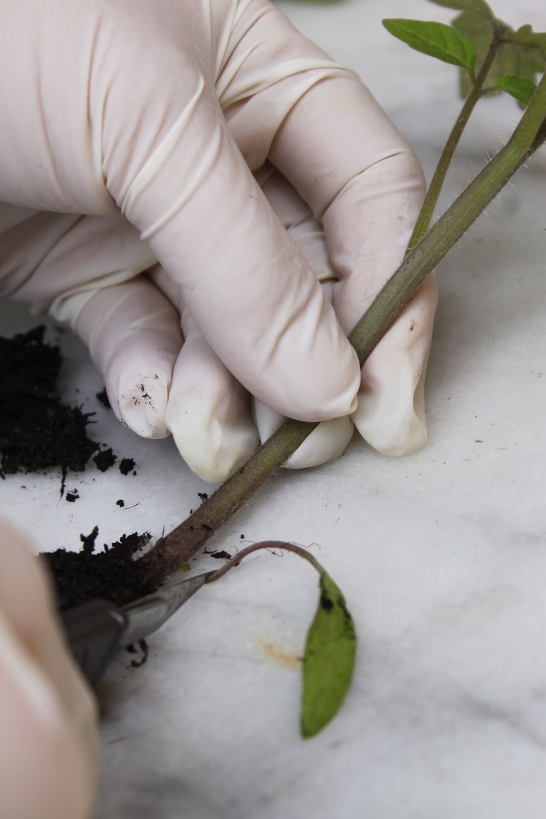 | 1. Take the rootstock plant (the blight resistant/bottom half) out of the pot, and remove surplus soil. |