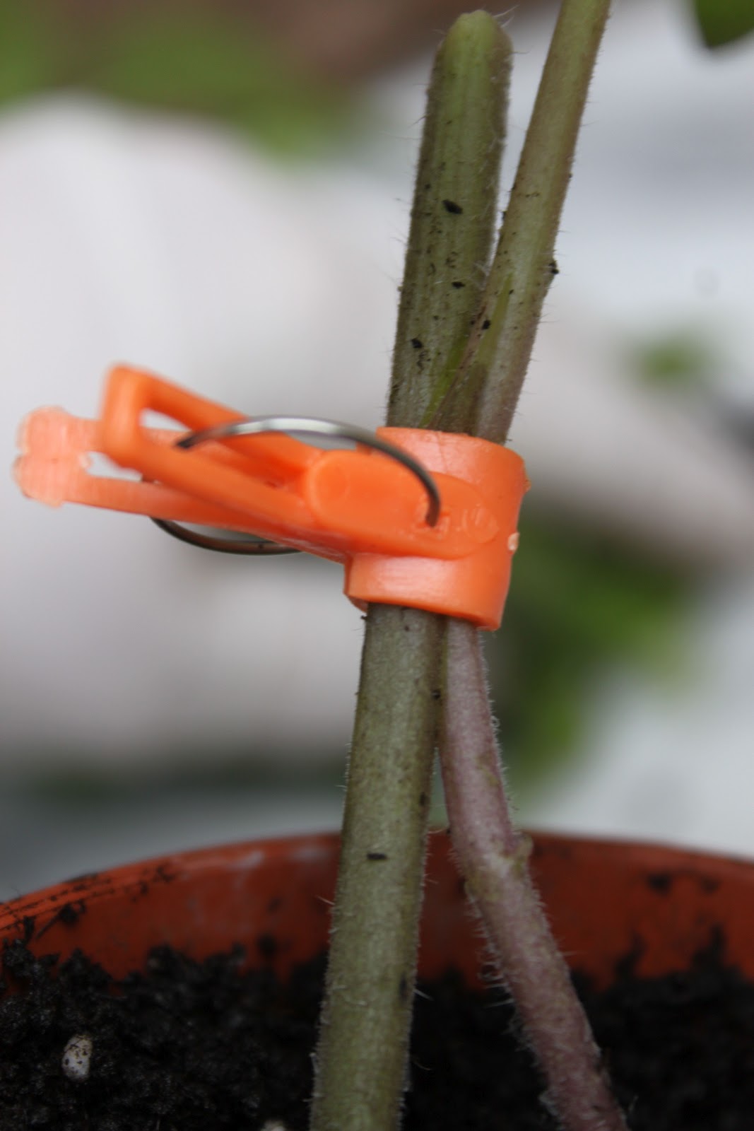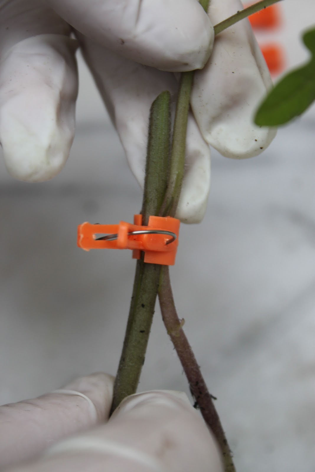 | 8. The grafting clips apply just enough pressure to keep the cut sides pressed together without damage the plant tissues. |
