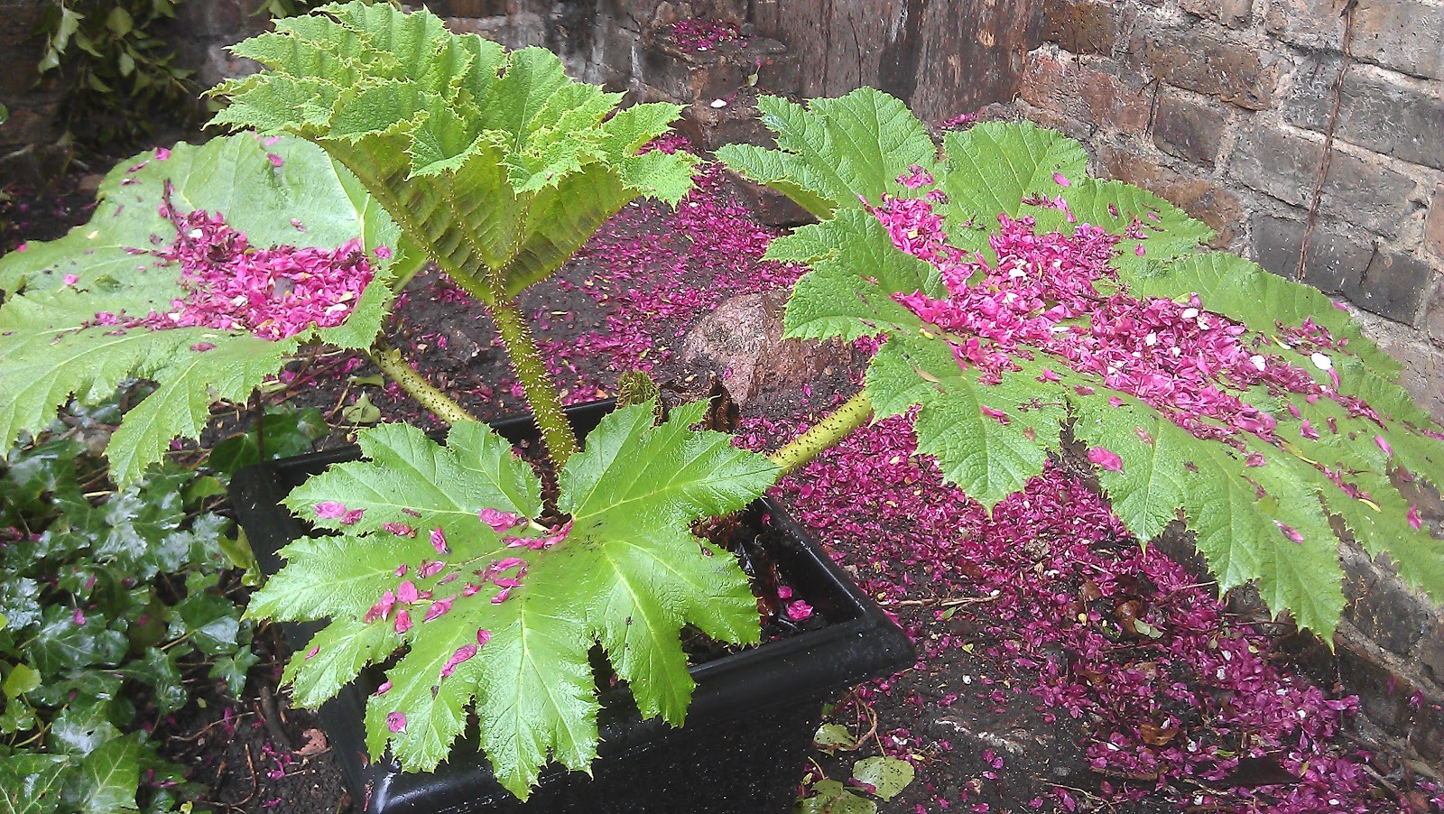 | A young Gunnera manicata covered in blossom from the tree above. |