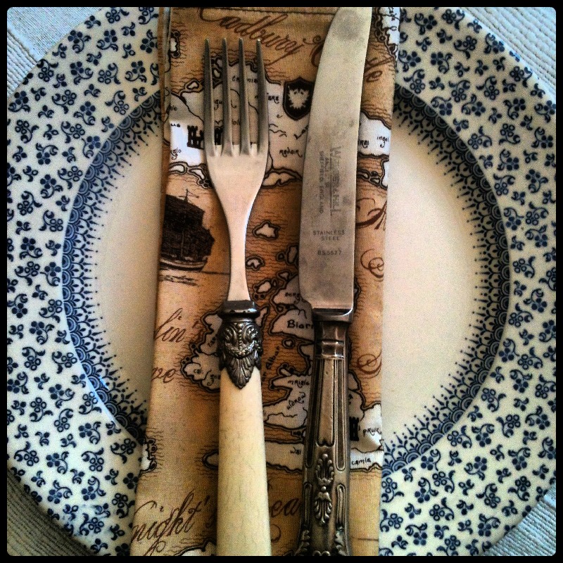 I’ve been searching for map-type fabric to make, ta da! the mapkins. I imported the material from the US but have struggled to find enough. Any readers that have a source of map fabric, get in touch. My dressmaker Ruth Bennett managed to make me a map dress and 50 n/mapkins but we need more.