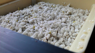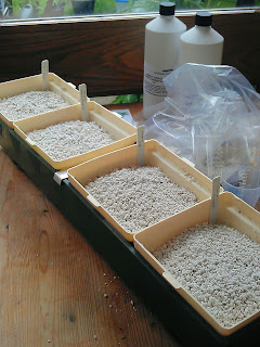 | The kit: long plastic trough and four pots. The growing medium, a mix of perlite and vermiculite, containers with liquid nutrients and four packets of seeds. |