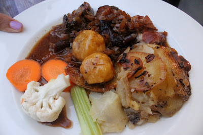 | Pork knuckle braised in dark beer, dumplings, pickles, potatoes |