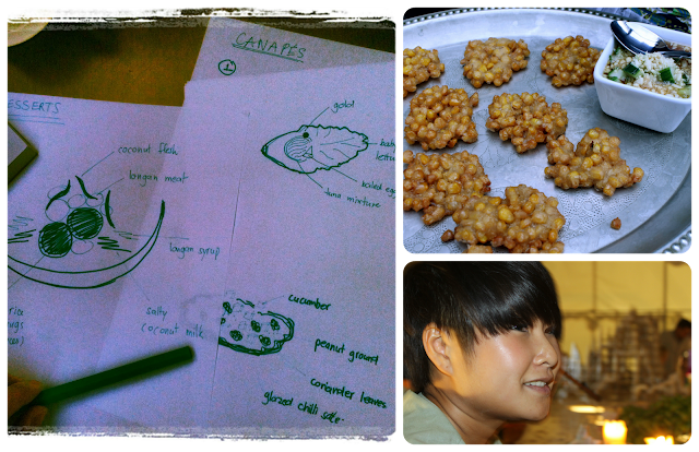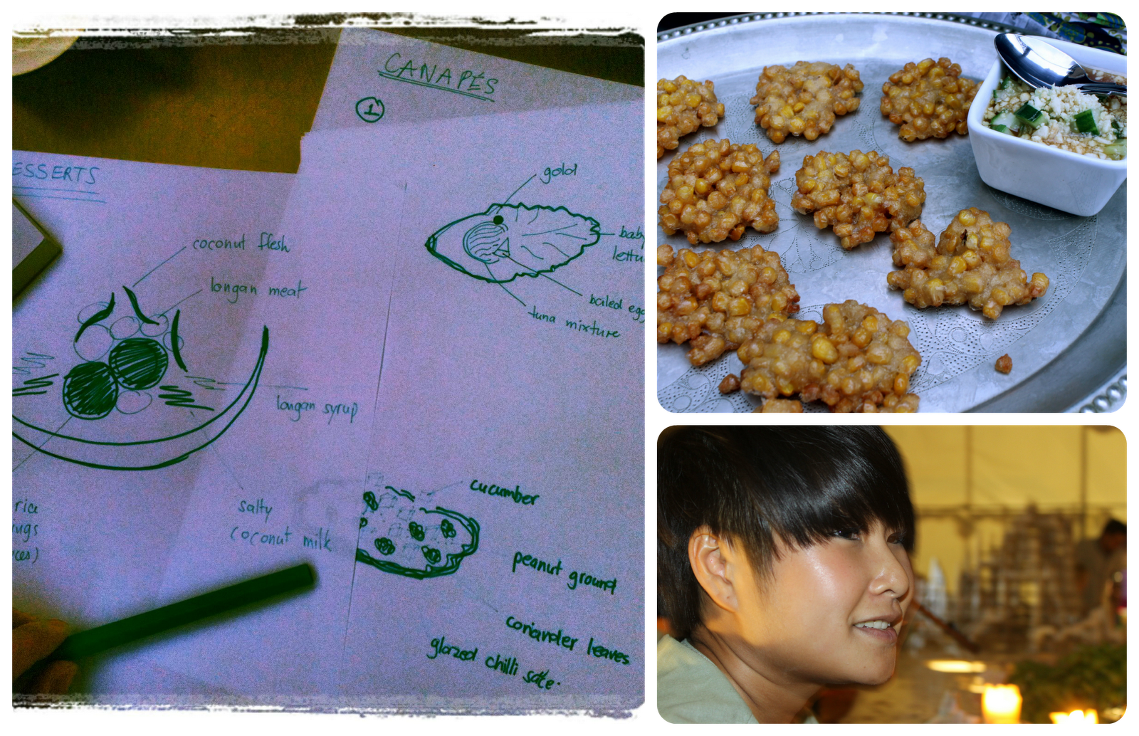 Perm’s drawings to describe plating, Thai sweet corn fritters (tapioca flour is the secret),  performer at the event.