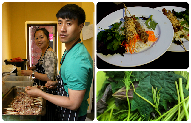 Uyen and Perm who after soaking the skewers, threaded on the pork; Uyen’s main course; herbs used in Vietnamese cookery.
