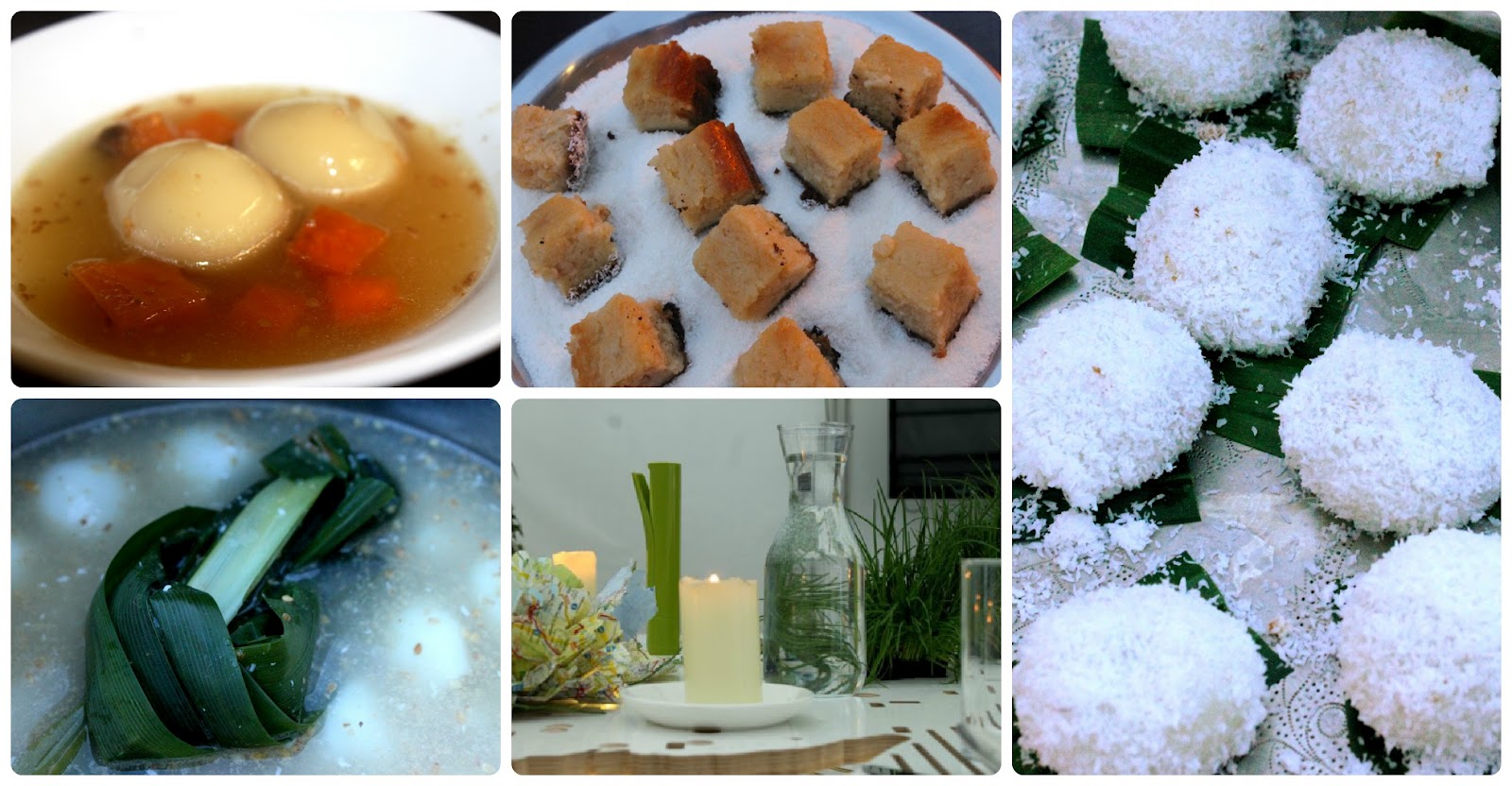 Pandan leaves had several uses: to plate up the petits fours, also in the soup for the rice ball dessert. Pandan or Screwpine leaves are employed extensively in Singaporean cookery, with a flavour close to vanilla. In Singapore, most people have them growing wild in their back garden. I got mine from Wing Yip. It’s so exciting to finally find out how some of the adventurous ingredients available in Asian supermarkets are actually used.