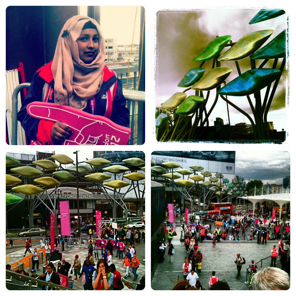 During the day I emerged for the first time from the thick-walled (no phone signal) turret of Stratford Old Town and walked to Stratford station and Westfield shopping centre. There are thousands of folk, all good-humoured, from all nations of the earth. Groups of people are shouting the benefits of, variously, Islam, The Bible and Veganism. Stratford has, for a couple of weeks, evolved into a thronging market place for all humanity. Yes, the specially commissioned leaf sculptures look like fish and are even called ‘shoal’ but Stratford, on the meridian, zero degrees longitude, is where it’s at right now.