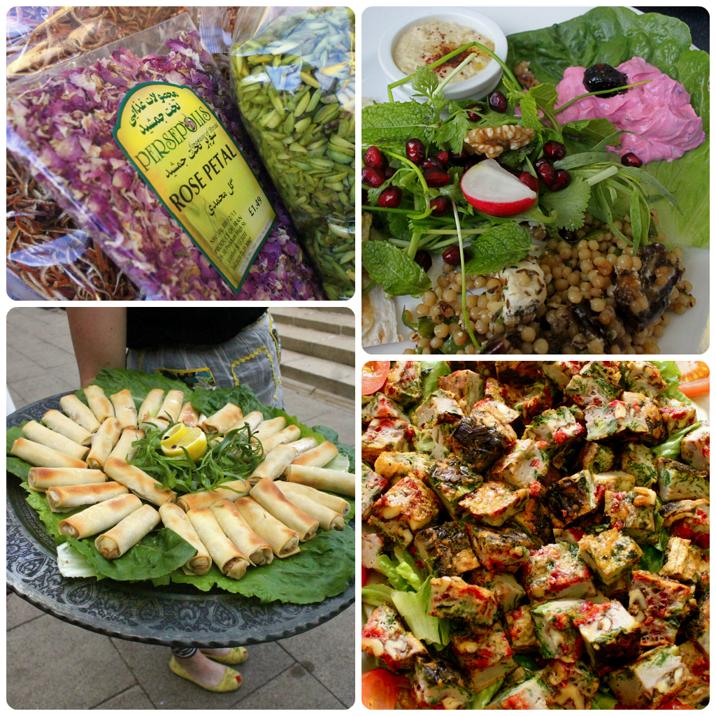 Persian cuisine loves sour flavours like barberries, preserved lemons, fresh yoghurt, pomegranate and sour cherries. It also uses pungent rich ingredients such as rose petals, slivered pistachios, almonds, walnuts ranging to bitter flavours such as dried orange peel. Many of these ingredients were provided by Sally’s shop Persepolis.