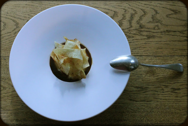 The dish fuses a classic British ingredient, Marmite with a traditional Auvergnat dish, aligot. He calls it La Duchesse de Marmite (after pommes duchesse). It has a couronne (crown) of deep fried crisps. No dish uses more than three elements. So here we have potato both purée and fried, cheese (Tomme) and Marmite.