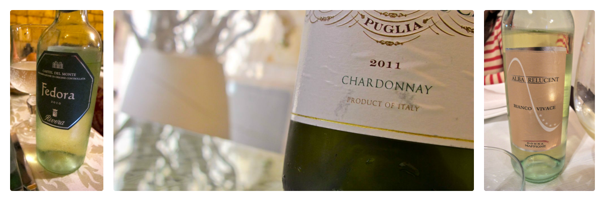 | The wine was excellent. Puglia is famous for the primitivo grape, but I also enjoyed the chardonnay and the lovely light ‘vivace’ wine on the left, which had a mildly petillant bubble. |