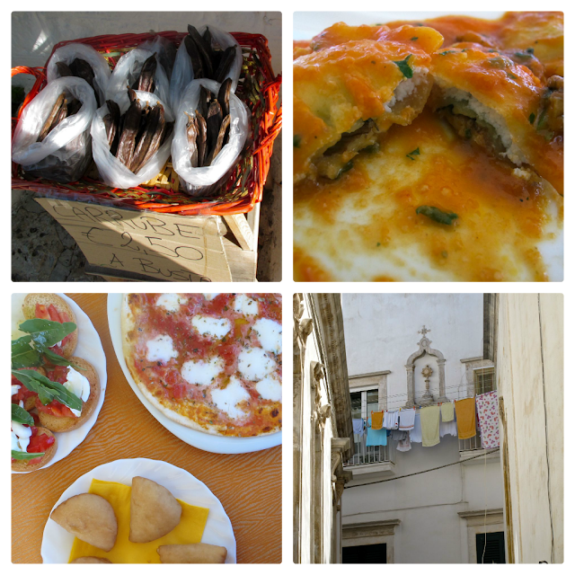 | Carob pods; ricotta stuffed ravioli; the thinnest pizza and freshest, spiciest rocket; washing in Martina Franca |