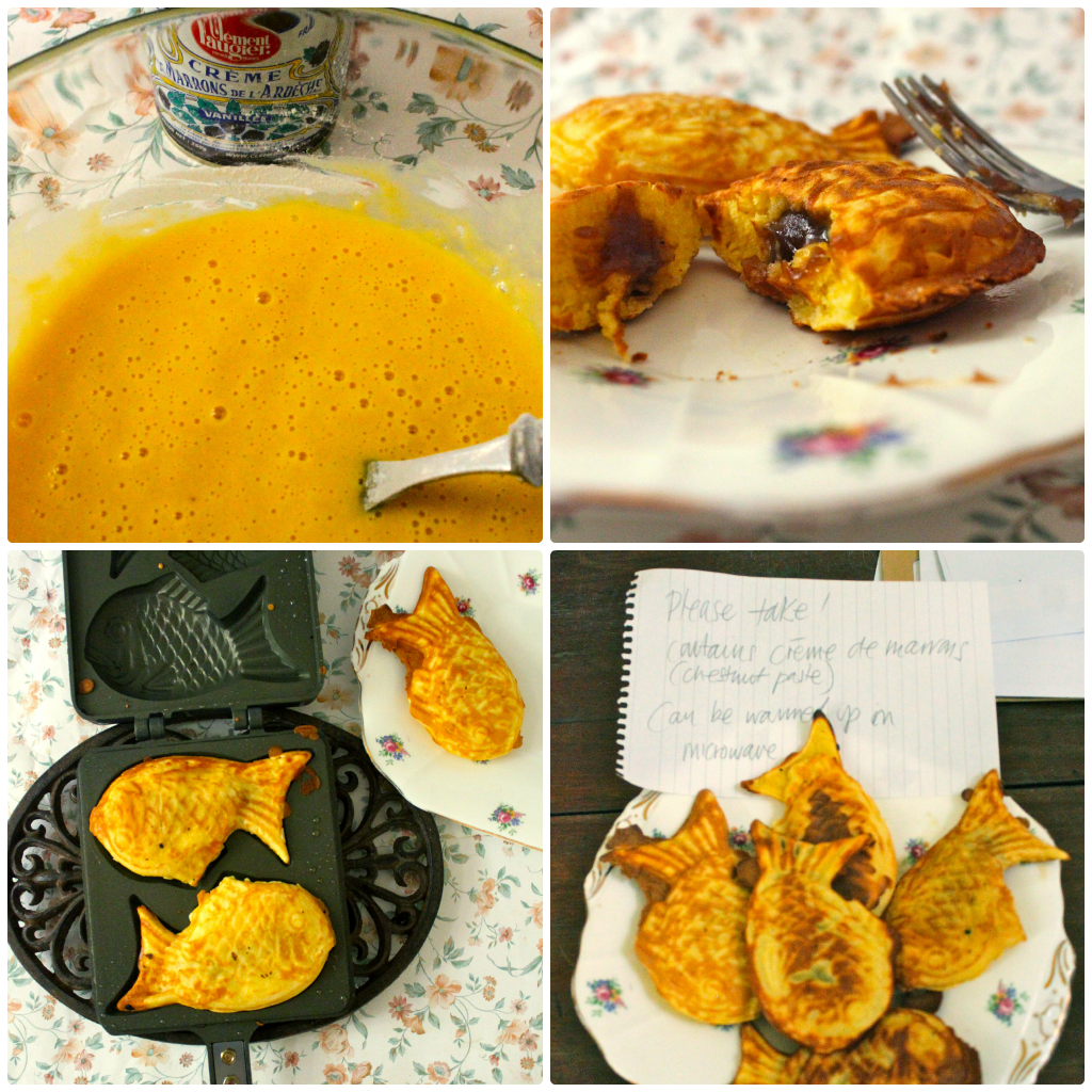Taiyaki cakes are fish shaped pancakes, usually filled with sweet bean paste, that are popular as a street food in Korea and Japan. I bought a Taikyaki pan for Bestival, thinking the shape would go with the shipboard theme, but unfortunately it arrived too late from Korea.