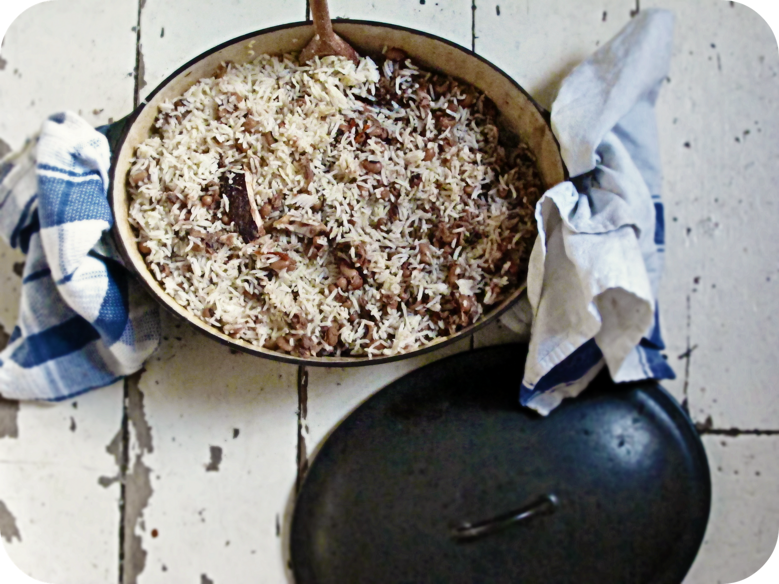 Rice and peas is the mainstay food of Jamaican cuisine. Peas is beans: the further south, the darker the legume. Caribbean islands near to the southern states of America, will often use the black eyed pea as I have. Jamaicans use the pinto bean. Islands closer to South America will use the small black turtle bean.