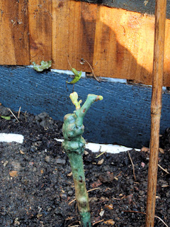 In the first year, the main stem of the vine will grow. Keep this on the straight and narrow by loosely tying it to the stake. Use a soft tie rather than plastic wire.