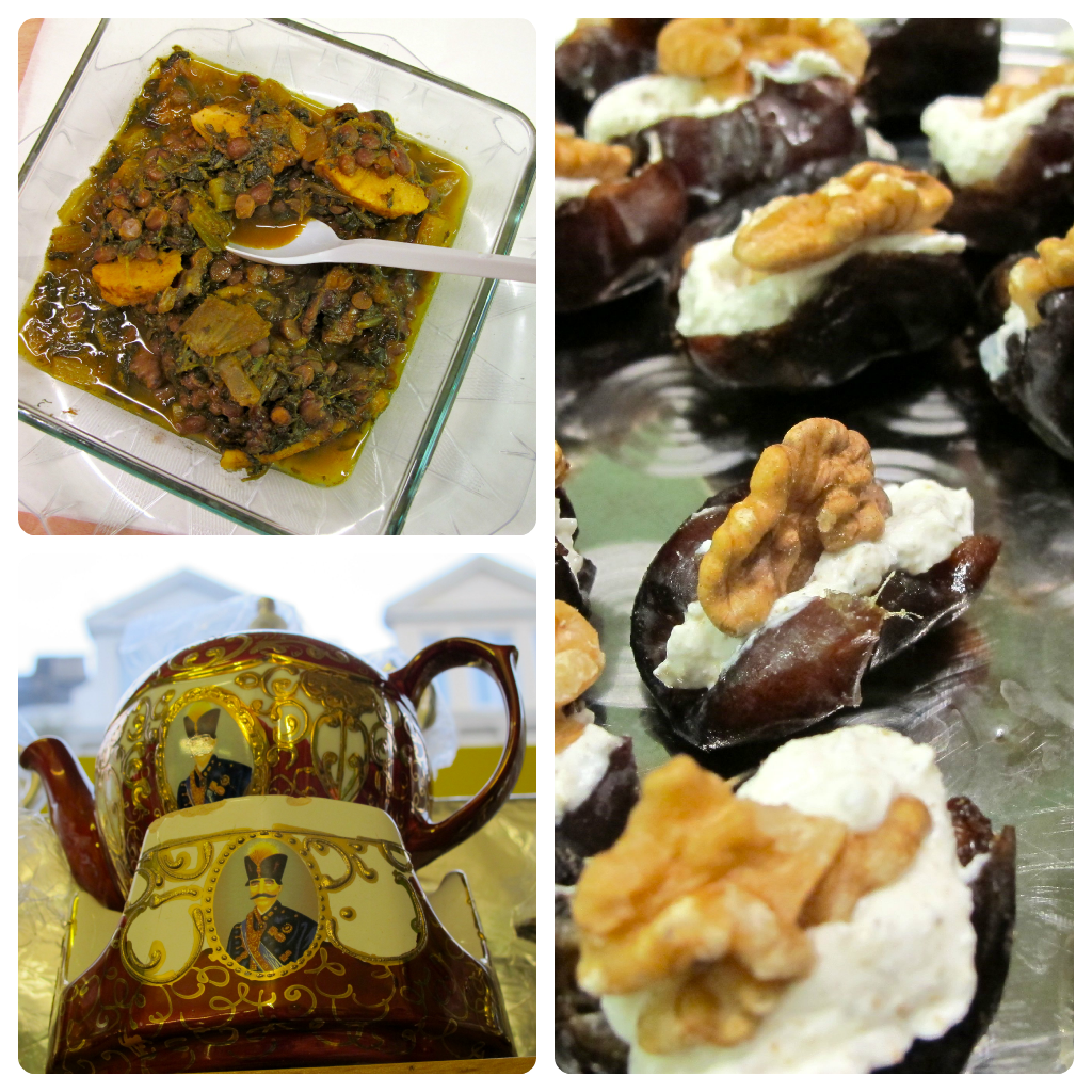 Top left: an unusual and tasty stew, quince and walnut, that Sally made for lunch; stuffed dates (recipe below). The teapot is known as Shah Abbas ware, a design that is on Iranian tableware,  which represents a 16th century Shah (ruler) but actually the image is of Nasruddin Shah.
