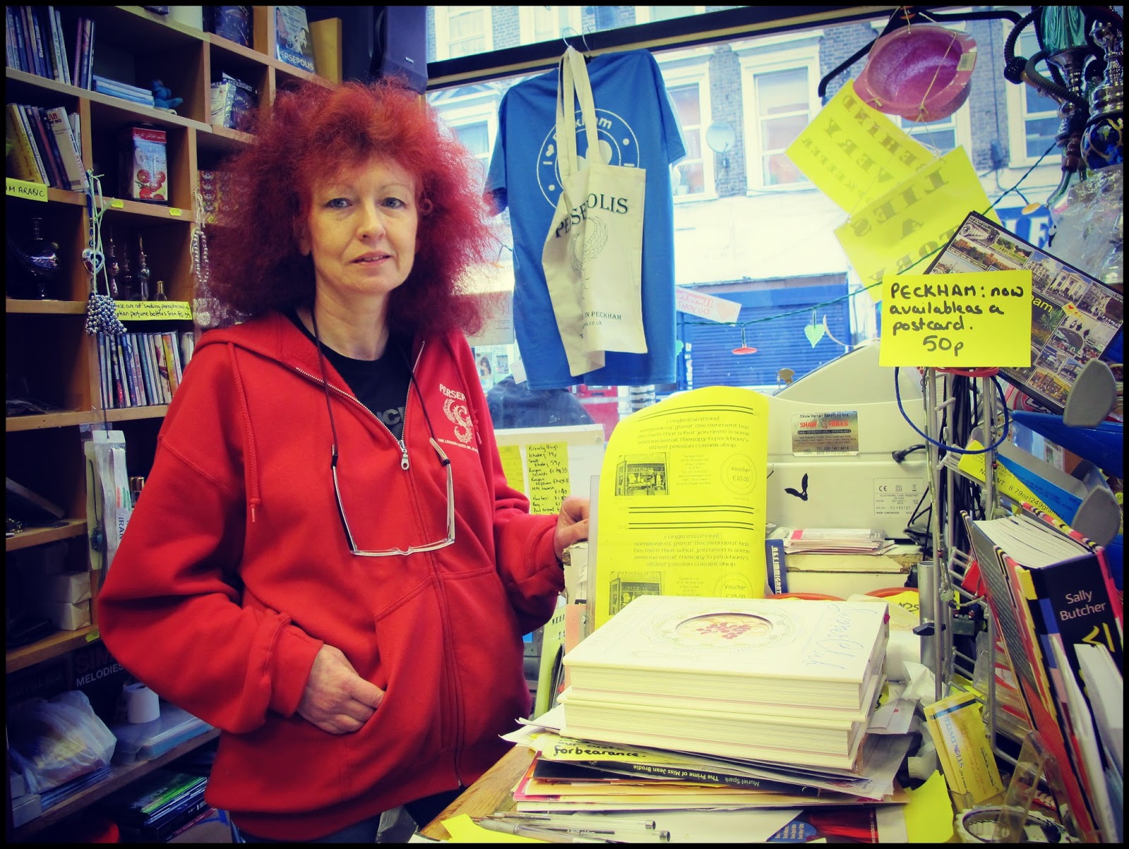 The flame-haired Sally Butcher, author of Persia in Peckham and Veggiestan, at the till.