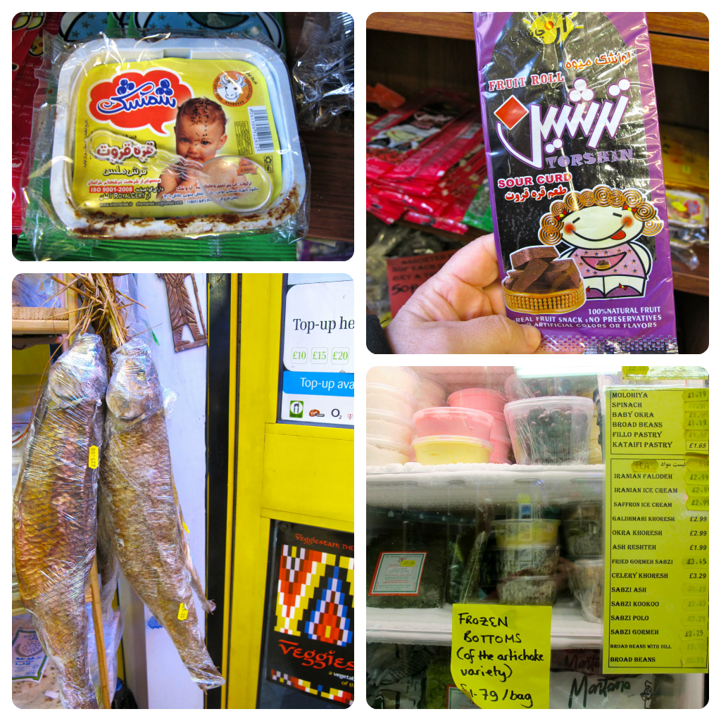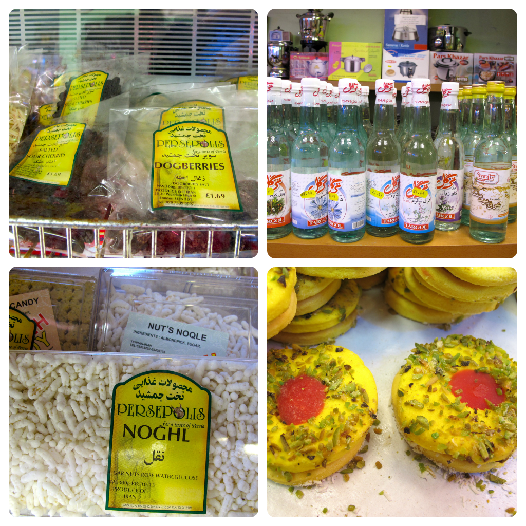 I love poking around food shops in foreign countries and visiting Persepolis gives a similar thrill.  Salted sour cherries, dogberries, rose water sugared ‘maggots’, cookies that are flown in from Iran two or three times a week and infused waters. The latter are used for health purposes in Iran, a kind of homeopathic remedy for ailments. The best known waters over here are orange flower water and rose water, but the Iranians also use willow extract water, mint water, quince seeds, borage water and several others. Aspirin is derived from the willow tree, Iranians will have a few drops of this water in the morning for their health. These are all described in Sally’s fascinating first book ‘Persia in Peckham’