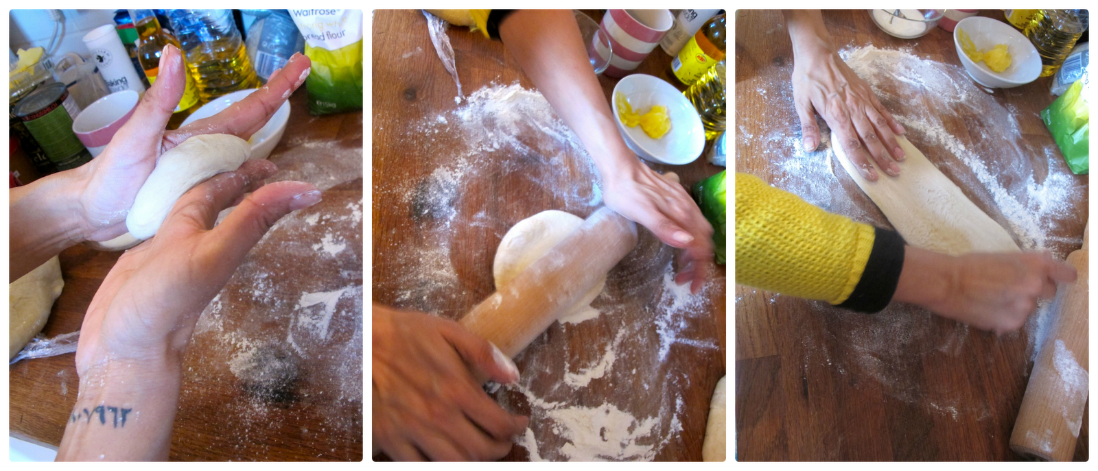 Scatter some flour onto a clean surface and roll out the ball into an oblong or tear drop shape.