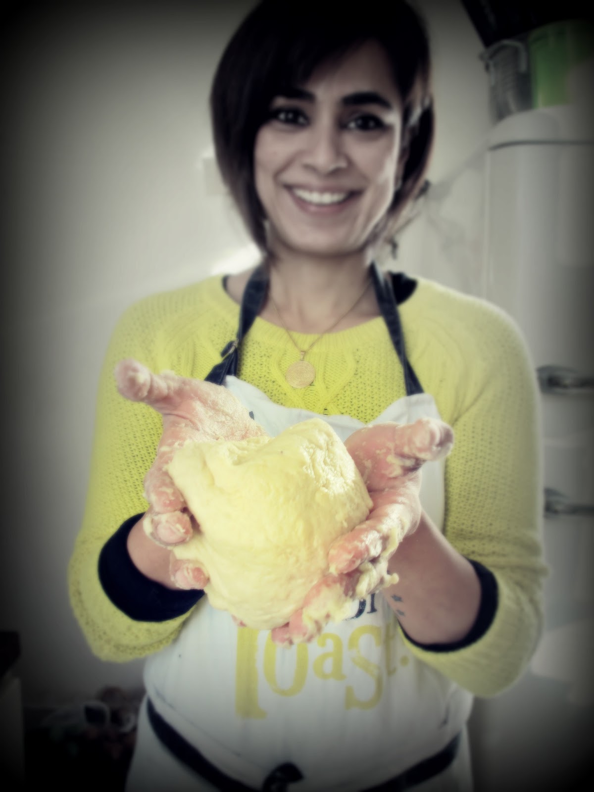 Sift the flour into a bowl and add the rest of the dry ingredients. Add the egg and the yoghurt, kneading the mixture in a bowl. Finally bind together with some whole milk until you have a flexible dough mixture.
