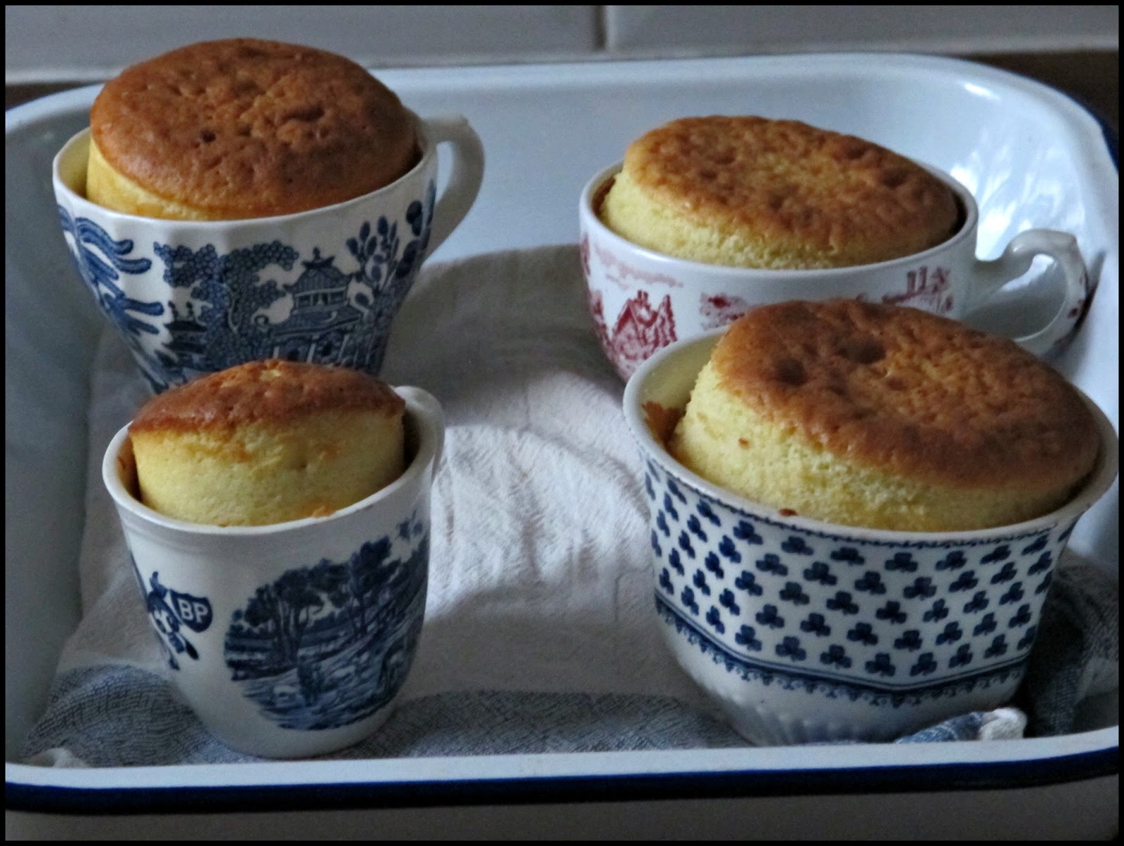 Spoon the cake mixture into your tea cup. Place the teacups onto a baking tray with a teatowel in the bottom as an extra failsafe in case of cracking. Bake in the preheated oven for about 15 minutes or until a skewer inserted in the centre of a cake comes out clean. Aga instructions, I did this on the bottom shelf of the baking oven.
