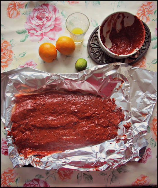 For the main course I made butterflied salmon (they can do it at your fishmongers) basted with a Mexican achiote, roasted and soaked Ancho chillis and citrus (orange and lime) paste. This would be even better on the barbeque but as it was pissing down outside, I roasted this in the hot oven of the Aga. We had this with brussel sprouts in red wine and roast potatoes and parsnips.