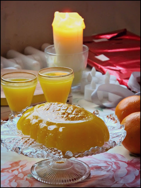 I then mixed the clementine juice and the rest of the gelatine leaves, heating gently until melted. I let it cool and then poured this into the mould.