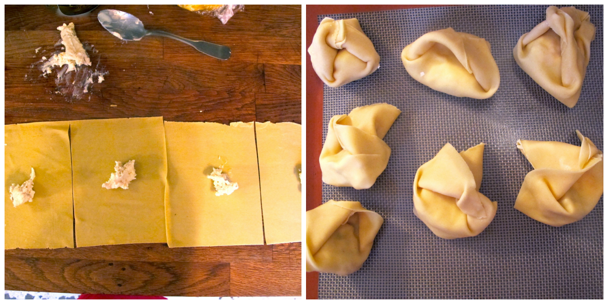 I laid out the strip of pasta, cut 6 to 7 cm squares and placed a small ball of Italian blue cheese in the middle. I seasoned the ball with salt and pepper. Then using the remaining egg white, I used a pastry brush to moisten the edges of the pasta square and folded it into a tortellini/loni shape.