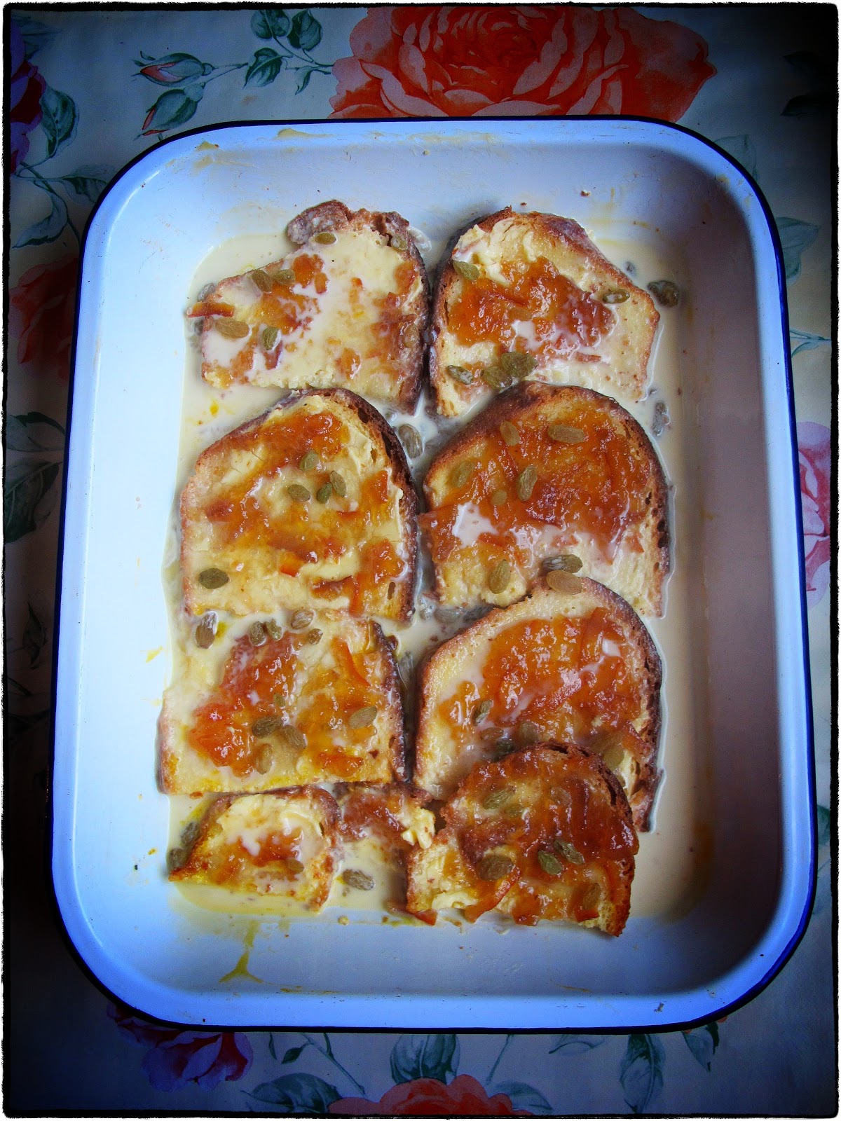 Butter a baking tin. Cut the brioche into slices and butter both sides. Spread marmalade on the side facing upwards.